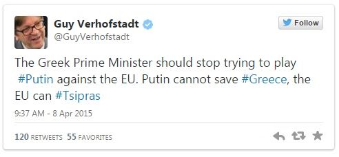 Να σταματήσει να παίζει το ‘χαρτί’ του Πούτιν εναντίον της ΕΕ, κάλεσε όμως την ίδια στιγμή τον πρωθυπουργό ο πρόεδρος της πολιτικής ομάδας των Φιλελεύθερων Δημοκρατών στο Ευρωκοινοβούλιο Γκι Φερχόφσταντ με σχόλιό του στο Twitter, σημειώνοντας ότι ο Πούτιν δεν μπορεί να σώσει την Ελλάδα, η ΕΕ μπορεί.