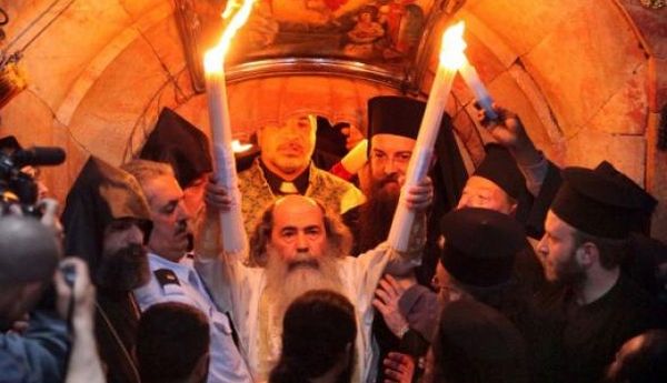 Το τελετουργικό Η τελετή αρχίζει με την είσοδο του πατριάρχη Θεόφιλου Γ’ στον ναό, συνοδευόμενου από αρχιερείς, ιερείς και διακόνους του Πατριαρχείου Ιεροσολύμων, αλλά και τον Αρμένιο πατριάρχη. Ακολουθεί η Ιερή Λιτανεία και η αποσφράγιση του Πανάγιου Τάφου, ο οποίος, σύμφωνα με την παράδοση, ελέγχεται ότι δεν εμπεριείχε τίποτα που να μπορούσε να ανάψει φωτιά και σφραγιστεί με βουλοκέρι την προηγούμενη μέρα. Τότε, ο πατριάρχης βγάζει την αρχιερατική στολή του και μένει μόνο με το λευκό στιχάριο, παίρνει τους σβηστούς πυρσούς και εισέρχεται στο Ιερό Κουβούκλιο. Όλα τα καντήλια στο κτιριακό συγκρότημα του Ναού της Αναστάσεως είναι σβηστά. Ο Πατριάρχης προσεύχεται στο εσωτερικό του Πανάγιου Τάφου. Χέρια απλώνονται από παντού και μέσα σε λίγα λεπτά ο ναός γεμίζει από φλόγες που «προχωρούν» μέχρι να καλύψουν όλο τον χώρο.