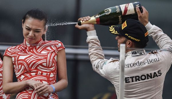 Ο νικητής του αγώνα μετά την απομονή όταν ήρθε η ώρα της σαμπάνιας ίσως για ν’ απομακρυνθεί λίγο από το Rosberg λόγω του ψυχροπολεμικού κλίματος που υπάρχει ανάμεσά τους ίσως και γιατί η αδρεναλίνη τον οδήγησε στις όμορφες εκπροσώπους του κινέζικου κάλλους που ήταν επιφορτισμένες με την απονομή κατέβρεξε μια εξ’ αυτών με σαμπάνια. Μια συνήθη ενέργεια στο βάθρο. Η αντίδραση της νεαρής Κινέζας έδειξε ενόχληση και αυτή δεν είναι η πρώτη φορά που κάνει κάτι ανάλογο ο Hamilton. Είχε καταβρέξει και τις Ισπανίδες στο βάθρο της Βαρκελώνης πέρυσι.