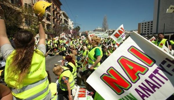 Οι εργαζόμενοι από 14 σωματεία των μεταλλείων Χαλκιδικής κρατώντας σημαίες που γράφουν «’Ναι’ στην ανάπτυξη», φωνάζοντας συνθήματα και χτυπώντας ρυθμικά τα κράνη τους στην άσφαλτο κατέστησαν σαφές ότι δεν πρόκειται να αποχωρήσουν από την Αθήνα, εάν η κυβέρνηση δεν πάρει ξεκάθαρη θέση σε σχέση με τη λειτουργία των μεταλλείων.
