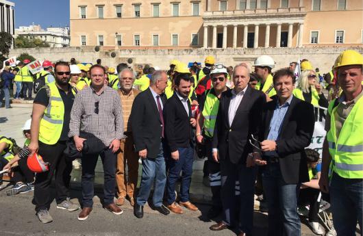 Κλιμάκιο της Νέας Δημοκρατίας, με τη συμμετοχή του Βουλευτή Χαλκιδικής Γιώργου Βαγιωνά, του Υπεύθυνου του Τομέα Περιβάλλοντος, Ενέργειας & Κλιματικής Αλλαγής Ευάγγελου Μπασιάκου, του Γραμματέα της Πολιτικής Επιτροπής Ανδρέα Παπαμιμίκου, του Γραμματέα Συνδικαλιστικών Φορέων Θεόδωρου Ματάλα και του Μέλους της Εκτελεστικής Γραμματείας Φίλιππου Ταυρή, συναντήθηκε με εκπροσώπους των συγκεντρωμένων μεταλλωρύχων έξω από τη Βουλή. Αμέσως μετά ο κ. Α. Παπαμιμίκος έκανε την ακόλουθη δήλωση: “Η χώρα χρειάζεται σταθερότητα. Χρειάζεται ιδιωτικές επενδύσεις. Μόνο έτσι θα χτίσει ισχυρή οικονομία, μόνο έτσι θα δημιουργηθούν δουλειές. Ας αφήσει επιτέλους η Κυβέρνηση τα επικοινωνιακά παιχνίδια και ας ασχοληθεί επί της ουσίας με τους ανθρώπους και τη χώρα”.