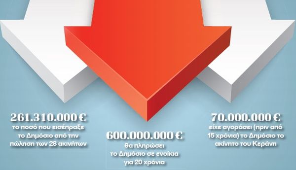 Την ίδια στιγμή, όμως, το Δημόσιο καλείται να πληρώσει για τα 20 χρόνια που δεσμεύεται να μισθώνει τα ακίνητα περί τα 600.000.000 ευρώ, δηλαδή ποσό τριπλάσιο του οφέλους που είχε από την πώλησή τους. Επιπλέον, η συμφωνία προβλέπει ότι το ελληνικό Δημόσιο, αν θέλει να αποκτήσει πάλι τα ακίνητα μετά τη λήξη της εικοσαετούς περιόδου μίσθωσης, πρέπει να πληρώσει τίμημα που αντιστοιχεί στην αγοραία αξία τους εκείνη την εποχή!