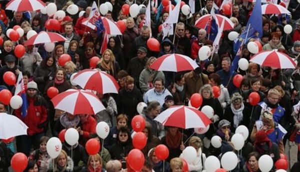 Υπό τους ήχους σφυριχτρών και τρομπετών, τέσσερις πορείες ακολούθησαν διαφορετικά δρομολόγια περνώντας μπροστά από τα υπουργεία Οικονομικών, Παιδείας και Εργασίας, πριν συγκλίνουν μπροστά από την έδρα της πρωθυπουργού Εύα Κόπατς, η οποία ήταν απούσα καθώς βρίσκεται στην Ιταλία. Στο ευρύ φάσμα των διεκδικήσεων των συνδικάτων περιλαμβάνονται επίσης το ύψος του κατώτερου μισθού, οι όροι συνταξιοδότησης, καθώς και η συντάξιμη ηλικία, οι φόροι που καταβάλλουν οι πιο φτωχοί από τους πολίτες, οι ώρες εργασίας και η κοινωνική ασφάλιση.