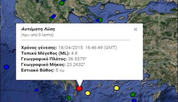 Σύμφωνα με την ανακοίνωση του Γεωδυναμικού Ινστιτούτου του Εθνικού Αστεροσκοπείου Αθηνών, η σεισμική δόνηση που έγινε στις 19:46 είχε επίκεντρο 8 χλμ ανατολικά της Νεάπολης Βοιών και 174 χλμ νοτιοδυτικά της Αθήνας.