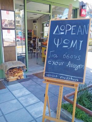 «Δωρεάν ψωμί για όσους έχουν ανάγκη». Ο μαυροπίνακας με τη φράση αυτή που τοποθέτησε εδώ και μερικές ημέρες έξω από το κατάστημά της στη Θεσσαλονίκη η οικογένεια Λιμπαντούδη δεν περνά απαρατήρητος. Ακριβώς δίπλα ένα κουτί από πλεξιγκλάς γεμάτο ψωμιά και κουλούρια «καλεί» ανθρώπους που στερούνται ακόμα και τα βασικά να… κοπιάσουν και να μοιραστούν με τους ιδιοκτήτες αυτή την πράξη αλληλεγγύης.