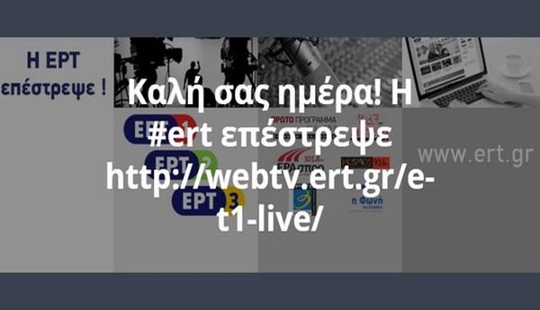 Με την ανάκρουση του εθνικού ύμνου, σήμερα στις 06:00 το πρωί, η ΕΡΤ επανήλθε στους δέκτες, μετά από δύο χρόνια “μαύρου”. Η Δημόσια Ραδιοτηλεόραση “επιστρέφει”, σχεδόν σε πλήρη ανάπτυξη, με την ΕΡΤ3 να ακολουθεί στον σχεδιασμό επαναλειτουργίας όλων των σταθμών.