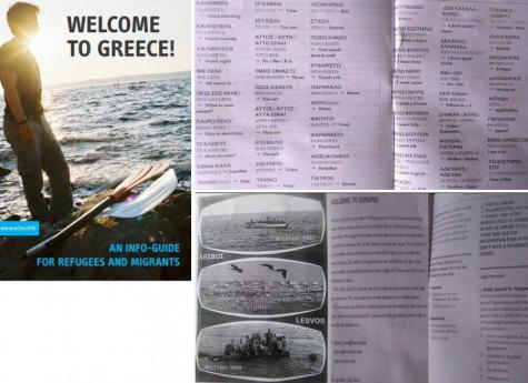 Πρόσφυγες και λαθρομετανάστες, που συνωστίζονται στα παράλια της Τουρκίας για να περάσουν παράνομα στην Ελλάδα και την Ευρώπη, εφοδιάζονται με ένα φυλλάδιο -αυτό που δημοσιεύουμε- το οποίο έχει τίτλο «Welcome To Greece» (Καλώς ήλθες στην Ελλάδα) και στο εξώφυλλο δείχνει ένα μετανάστη μόλις έχει… αράξει σε μια παραλία να κοιτά την ανατολή του ήλιου.