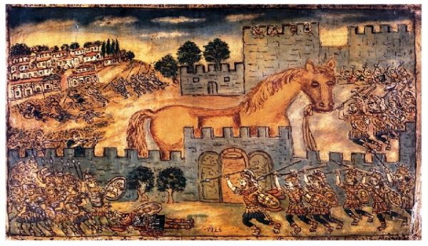Ο κατασκευαστής του Δούρειου Ίππου Η Αθηνά συμβούλευσε τον Οδυσσέα, να κατασκευάσει ο Επειός ένα μεγάλο ξύλινο άλογο. Πράγματι ο Επειός ανταποκρίθηκε. Δημιούργησε ένα ξύλινο άλογο με κρυφά ανοίγματα στις δυο πλευρές, το οποίο μπορούσε να χωρέσει πάνω από 2000 Αχαιούς. Η θεά τους είχε καθοδηγήσει να χαράξουν τη φράση: «Έλληνες Αθηνά χαριστήριον». Στα «σπλάχνα» του αλογου μπήκαν οι πιο γενναίοι, ανάμεσά τους ο Οδυσσέας, ο Διομήδης, ο Μενέλαος, ο Αίας, ο Νεοπτόλεμος και κατασκευαστής Επειός, που ήξερε να ανοίγει τις κρύπτες. Μπορεί το σχέδιο να ήταν καλά οργανωμένο ωστόσο σε περίπτωση που οι Τρώες τους ανακάλυπταν θα είχαν στα χέρια τους τα καλύτερα παλικάρια των Αχαιών. Οι υπόλοιποι Αχαιοί αποχώρησαν. Οι Τρώες ενώ προσπαθούσαν να ερμηνεύσουν την ξαφνική φυγή των Αχαιών είδαν το Δούρειο Ίππο. Αν και υπήρχαν ενστάσεις και δισταγμοί αποφασίζουν να μεταφέρουν το ξύλινο δώρο της θεάς μέσα στην πόλη. Οι Αχαιοί άφησαν επίτηδες πίσω το Σίνωνα ώστε να πιαστεί αιχμάλωτος και να πει στους Τρώες αυτά που έπρεπε να ακούσουν. Έτσι τους είπε μια ψεύτικη ιστορία για το άλογο: Η βοήθεια της Αθηνάς στους Αχαιούς έπαψε υποτίθεται να υπάρχει όταν ο Οδυσσέας και ο Διομήδης άγγιξαν το Παλλάδιο με χέρια που είχαν διαπράξει φόνους. Το Παλλάδιο ήταν το μικρό ιερό, ξύλινο ειδώλιο της Αθηνάς, που προστάτευε την πόλη από τις πολιορκίες. Το είχε όμως κλέψει ο πανούργος Οδυσσέας. Ο Κάλχας, ο μάντης του στρατοπέδου των Αχαιών τους είπε πως η πράξη αυτή εξόργισε την Αθηνά η οποία δεν ήταν πια με το μέρος τους. Έπρεπε λοιπόν να φύγουν όσο γρηγορότερα γινόταν και να σταματήσουν άμεσα την πολιορκία. Γι αυτό έφτιαξαν το τεράστιο ξύλινο άλογο για να την εξευμενίσουν. «Η άλωση της Τροίας» Θεόφιλος Χατζημιχαήλ.