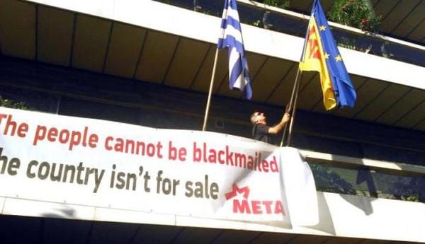 Όπως αναφέρει το left.gr, οι συνδικαλιστές του ΜΕΤΑ έχουν αναρτήσει δύο μεγάλα πανό -το ένα στην αγγλική γλώσσα- στα γραφεία της Κομισιόν: το πρώτο αναγράφει «Οι λαοί δεν εκβιάζονται – Η χώρα δεν πωλείται», και το δεύτερο, που αναρτήθηκε στον πρώτο όροφο των γραφείων της Κομισιόν στην Ελλάδα, «The people cannot be blackmailed – The country isn’t for sale».