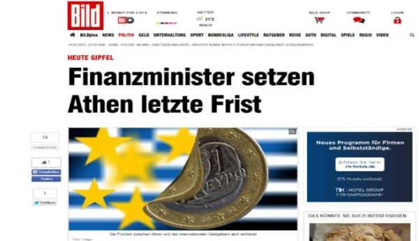 Με τον χαρακτηριστικό τίτλο «Υπουργοί Οικονομικών δίνουν τελευταία διορία στην Ελλάδα», αναρτήθηκε λίγο μετά τα μεσάνυχτα δημοσίευμα στην ηλεκτρονική έκδοση της γερμανικής εφημερίδας «Bild» το οποίο περιλαμβάνει δηλώσεις των υπουργών Οικονομικών της Γερμανίας, Βόλφγκανγκ Σόιμπλε, του Βελγίου, Γιόχαν φαν Όφερτφελντ, της Λιθουανίας Ριμάντας Σάντζιους και της Σλοβενίας Ντούσαν Μράμορ ενόψει της συνεδρίασης του Eurogroup απόψε στο Λουξεμβούργο.