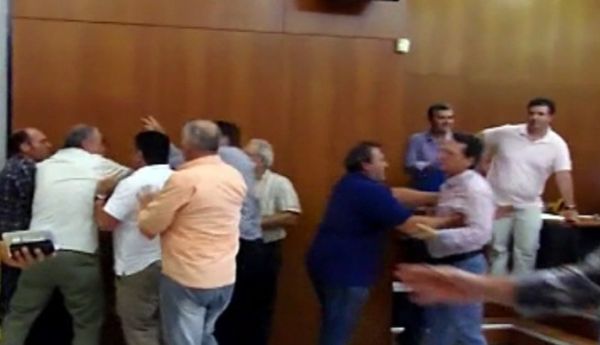 Σε ρινγκ μετατράπηκε το δημαρχείο Αχαρνών, καθώς δημοτικοί σύμβουλοι αντάλλαξαν βαριές εκφράσεις και τελικά πιάστηκαν στα χέρια, κατά τη σημερινή συνεδρίαση. Πρωταγωνιστές του επεισοδίου ήταν ο δημοτικός σύμβουλος της αντιπολίτευσης, Παναγιώτης Γρηγοριάδης, και ο πρόεδρος του δημοτικού ιδρύματος «Αρωγή», Νίκος Γκασούκας. Το επεισόδιο προκάλεσε η αντιδικία που είχε ο κ. Γρηγοριάδης με μερίδα συμβούλων της αντιπολίτευσης για την πληρωμή και τοποθέτηση αγωγών ακαθάρτων. «Μου σήκωσε το χέρι για να κάνει μια χειρονομία και του έριξα μια σφαλιάρα γιατί με προκάλεσε. Δεν είμαι αγενής, αλλά είμαι επικεφαλής παράταξης και πρέπει να προστατέψω την αξιοπρέπειά μου», δήλωσε ο κ. Γρηγοριάδης, στην κάμερα του Alpha.