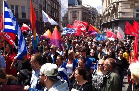 Πάνω από 50 οργανώσεις απηύθυναν κάλεσμα σήμερα για συγκέντρωση και πορεία στις Βρυξέλλες υπέρ της χώρας μας, ζητώντας το τέλος της λιτότητας στην Ευρώπη. Η πορεία έγινε μια μέρα μετά τις αντίστοιχες συγκεντρώσεις σε Παρίσι και Λονδίνο και λίγο πριν τη συγκέντρωση στο Σύνταγμα, το απόγευμα της Κυριακής, ενώ συμμετείχαν πάνω από 5.000 άτομα σύμφωνα με τις επίσημες εκτιμήσεις.