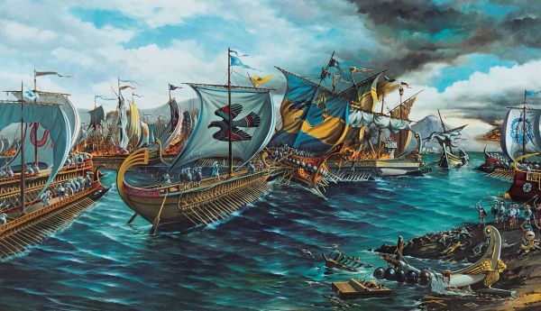 Οι Ελληνες στρατιώτες, ναύτες και κωπηλάτες, προετοιμάζονταν με ηρεμία και συζητούσαν τι θα κάνουν μετά τη μάχη. Είχαν σίγουρη τη νίκη. Από το ξημέρωμα, στρατιώτες και κωπηλάτες μπήκαν στα καράβια τους. Τους ένωνε ένας σκοπός: η ελευθερία της Ελλάδας. Θυσίασαν στους θεούς και τραγούδησαν τον παιάνα: «Ὦ παῖδες Ἑλλήνων, ἴτε… Νυν υπέρ πάντων αγών».