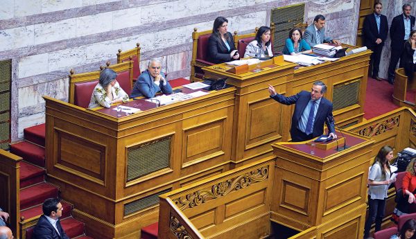 Από τα πρώτα λεπτά της ομιλίας του το θερμόμετρο στην αίθουσα της Ολομέλειας έδειξε «κόκκινο», με αφορμή ένα ατόπημα της Ζωής Κωνσταντοπούλου. Παρότι είχε επιλέξει να μιλήσει νωρίτερα ως απλή βουλευτής από το βήμα, όταν πήρε τον λόγο ο κ. Σαμαράς επέστρεψε στην έδρα ως πρόεδρος της Βουλής, παρότι ο Κανονισμός το απαγορεύει. Οι βουλευτές της Ν.Δ. «εξεγέρθηκαν» φωνάζοντας και χτυπώντας με τα χέρια τα έδρανα, ο κ. Σαμαράς κάλεσε τον πρωθυπουργό «να τη μαζέψει» και στο τέλος αποχώρησαν από την αίθουσα. Ο κ. Τσίπρας λειτούργησε πυροσβεστικά προτείνοντας δεκάλεπτο διάλειμμα, κατά τη διάρκεια του οποίου έγιναν «συστάσεις» στην κυρία Κωνσταντοπούλου να τηρήσει τον Κανονισμό, όπως κι έγινε, με αποτέλεσμα η Ν.Δ. να επιστρέψει στην αίθουσα. Νωρίτερα υπήρξε «επεισόδιο» και με τον γενικό γραμματέα του ΚΚΕ Δημήτρη Κουτσούμπα, ο οποίος αντέδρασε όταν η πρόεδρος σχολίασε την ομιλία του.