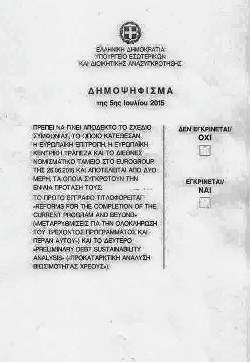 Το protothema.gr δημοσιεύει το ψηφοδέλτιο του δημοψηφίσματος που θα γίνει αυτή την Κυριακή. Γράφει πάνω: Πρέπει να γίνει αποδεκτό το σχέδιο συμφωνίας, το οποίο κατέθεσαν η Ευρωπαϊκή Επιτροπή, η Ευρωπαϊκή Κεντρική Τράπεζα και το Διεθνές Νομισματικό Ταμείο στο Eurogroup της 25.06.2015 και αποτελείται από δύο μέρη, τα οποία συγκροτούν την ενιαία πρότασή τους; Το πρώτο έγγραφο τιτλοφορείται «Reforms for the completion of the Current Program and Beyond» (Μεταρρυθμίσεις για την ολοκλήρωση του τρέχοντος προγράμματος και πέραν αυτού) και το δεύτερο «Preliminary Debt sustainability analysis» (προκαταρκτική ανάλυση βιωσιμότητας χρέους).
