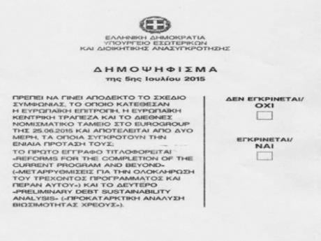 Το ψηφοδέλτιο του δημοψηφίσματος έχει “βγει” ήδη στην δημοσιότητα και συνοδεύεται από το ερώτημα και τις επιλογές “ΔΕΝ ΕΓΚΡΙΝΕΤΑΙ / ΌΧΙ” και “ΕΓΚΡΙΝΕΤΑΙ / ΝΑΙ” στα δεξιά του.
