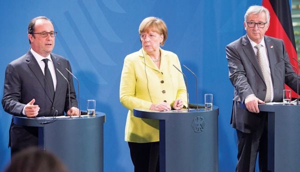 Η Γερμανίδα καγκελάριος πάντως εμφανίστηκε έχοντας δίπλα της τον αντικαγκελάριο Ζίγκμαρ Γκάμπριελ, όπου ο ένας «έκοβε» και ο άλλος «έραβε» σε βάρος της Ελλάδας. Η κυρία Μέρκελ άφησε έναν έμμεσο υπαινιγμό ότι το αποτέλεσμα του δημοψηφίσματος μπορεί να οδηγήσει σε Grexit, λέγοντας ότι «η Ευρώπη είναι πλέον σε θέση να αντεπεξέλθει πολύ καλύτερα σε ένα τέτοιο ενδεχόμενο», χρέωσε στην κυβέρνηση ότι διέκοψε τις διαπραγματεύσεις, αλλά υποστήριξε ότι αυτές μπορεί να συνεχιστούν αν η Αθήνα το επιθυμεί μετά το δημοψήφισμα. Απέφυγε ωστόσο να πάρει θέση για το δημοψήφισμα, λέγοντας: «Οι Ελληνες είναι περήφανος λαός, κανείς δεν θέλει να επηρεάσει τους πολίτες, αλλά θα πρέπει να ξέρει και τις συνέπειες». Ηταν η μόνη από τους ηγέτες που δεν έλαβε θέση υπέρ ή κατά.