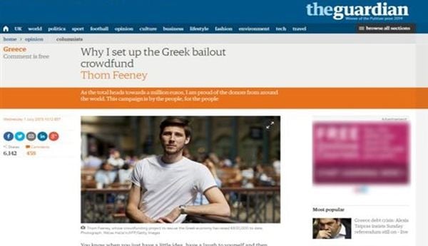 Ο 29χρονος Θομ Φίνι αποφάσισε να διοργανώσει crowdfunding για την Ελλάδα, ζητώντας από τους πολίτες να δώσουν τον οβολό τους για να συγκεντρωθούν τα 1,6 δισ. ευρώ που χρωστούσε η χώρα στο Διεθνές Νομισματικό Ταμείο. Η πρωτοβουλία αυτή έχει συγκεντρώσει περίπου ένα εκατομμύριο ευρώ και ο ίδιος εξηγεί στην βρετανική εφημερίδα The Guardian το σκεπτικό του.
