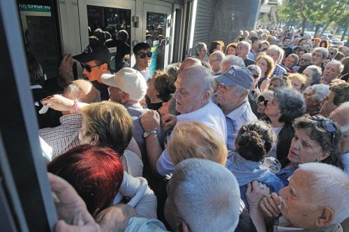 Εικόνες ντροπής και αίσχους έξω από υποκαταστήματα τραπεζών στη Θεσσαλονίκη. Υπερήλικες με προβλήματα υγείας και άδειες τσέπες, παρά την ισχυρή βροχόπτωση, σχημάτισαν ουρές εκατοντάδων μέτρων τα ξημερώματα της Τετάρτης, για να πάρουν τα 120 ευρώ από τις συντάξεις τους και να αγοράσουν φάρμακα και τρόφιμα. Οργή, αγανάκτηση και απόγνωση για το αλαλούμ που δημιουργήθηκε με τη σειρά προτεραιότητας, καθώς και όταν διαπιστώθηκε ότι δεν καταβλήθηκαν έγκαιρα οι συντάξεις του ΟΑΕΕ.