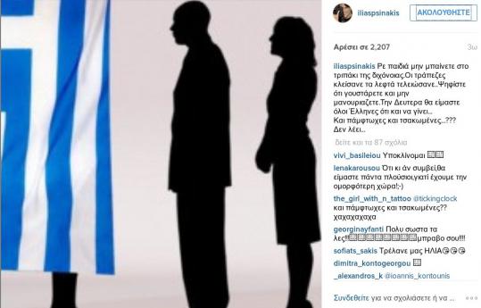 Ο Ηλίας Ψινάκης, έστειλε μήνυμά ενότητας μέσω του λογαριασμού του στο Instagram γράφοντας χαρακτηριστικά: «Ρε παιδιά μην μπαίνετε στο τριπάκι της διχόνοιας. Οι τράπεζες κλείσανε, τα λεφτά τελειώσανε..Ψηφίστε ότι γουστάρετε και μην μανουριάζετε.Τη Δευτέρα θα είμαστε όλοι Έλληνες ότι και να γίνει…Και πάμφτωχες και τσακωμένες…??? Δεν λέει…»