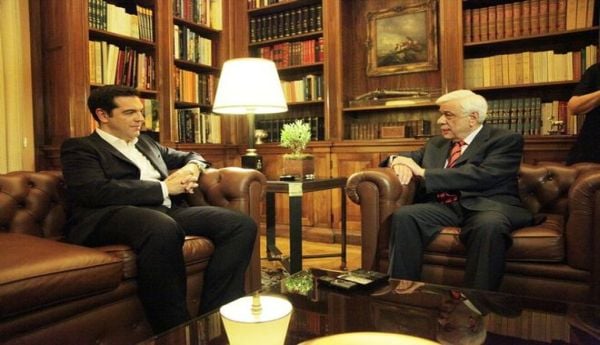 Ο κ. Τσίπρας έφτασε στο Προεδρικό Μέγαρο συνοδευόμενος από τον υπουργό Επικρατείας Ν. Παππά και τον κυβερνητικό εκπρόσωπο Γ. Σακελλαρίδη. Προέχει να σφυρηλατήσουμε την εθνική ομοψυχία και την ενότητα, να διαμορφώσουμε ένα υγιές και ισχυρό εθνικό μέτωπο για την αποκατάσταση της ομαλότητας στην οικονομία, προκειμένου να διεκδικήσουμε άμεσα λύση στα προβλήματα, στις διαπραγματεύσεις με τους εταίρους μας, ανέφερε ο κ. Τσίπρας στον κ. Παυλόπουλο ζητώντας τη σύγκληση του συμβουλίου πολιτικών αρχηγών.
