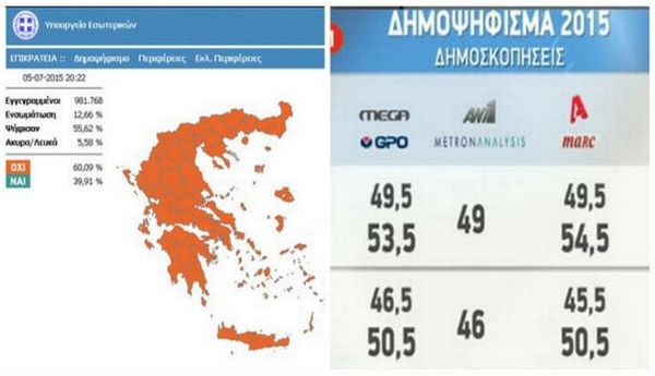 Έξω έπεσαν οι δημοσκόποι καθώς στις δημοσκοπήσεις των 19:00 οι τελικές εκτιμήσεις για το δημοψήφισμα έδειχνε το ΟΧΙ να κυμαίνεται από 49%-54,9% και το ΝΑΙ από 45,5%-50,5%.