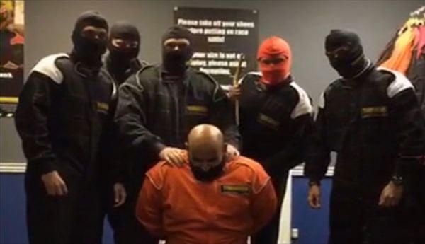 Στο βίντεο που γύρισαν και ανέβασαν στη συνέχεια στο διαδίκτυο οι υπάλληλοι της τράπεζας παρουσιάζονται να φορούν κουκούλες και να κουνούν απειλητικά ένα ψεύτικο μαχαίρι σε έναν άνδρα που φοράει μια πορτοκαλί στολή και είναι γονατισμένος, ενώ ένας από τους υπαλλήλους φωνάζει «Αλαχού Ακμπάρ» -Ο Θεός είναι μεγάλος.