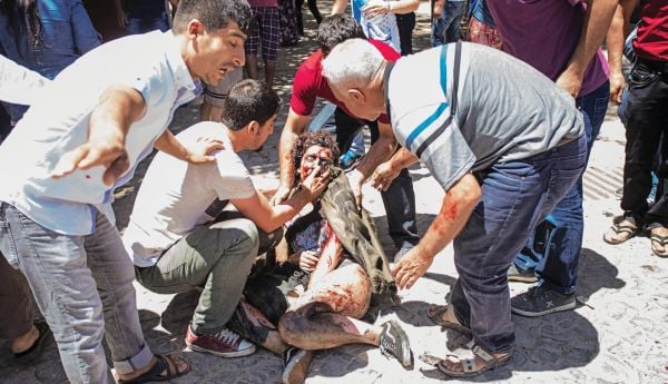 Σε νεκροταφείο (με τουλάχιστον 30 νεκρούς) μετατράπηκε η αυλή του κουρδικού πολιτιστικού κέντρου Αμάρα, στο Σουρούτς της νοτιοανατολικής Τουρκίας, στόχος -όπως ανέφερε χαρακτηριστικά στο BBC ο αναλυτής Τζιγιάρ Γκολ- μίας από τις πιο αιματηρές επιθέσεις αυτοκτονίας που έχει δει η Τουρκία εδώ και χρόνια. Για τρομοκρατική επίθεση έκαναν λόγο οι τουρκικές Αρχές, δείχνοντας προς την κατεύθυνση του Ισλαμικού Κράτους, ενώ, σύμφωνα με τον Αμπντουλάχ Σιφτσί, επαρχιακό κυβερνήτη της περιοχής, που απέχει μόλις 15 λεπτά από το συριακό Κομπάνι, εκτιμάται ότι την επίθεση αυτοκτονίας πραγματοποίησε μία 20χρονη τζιχαντίστρια