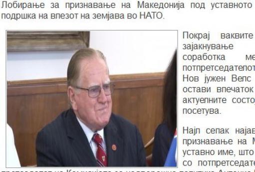 Ο Νάιλ, ωστόσο, δήλωσε ότι θα ασκήσει πιέσει για την αναγνώριση των Σκοπίων ως ‘Μακεδονία’, θέμα το οποίο αποτέλεσε αντικείμενο συζήτησης με τον αντιπρόεδρο και πρόεδρο της Επιτροπής Εξωτερικών Υποθέσεων , Αντόνιο Μιλοσόσκι.