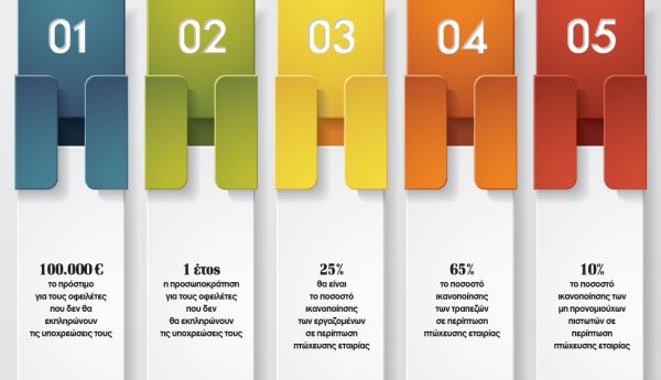 5. Στην περίπτωση πτώχευσης επιχειρήσεων και εκποίησης ακινήτων τους, το ποσοστό ικανοποίησης των εργαζομένων περιορίζεται στο 25% από 33,33%, ενώ των τραπεζών διαμορφώνεται στο 65% από 66,6%. Το υπόλοιπο 10% από το εκπλειστηρίασμα δίνεται στους μη προνομιούχους πιστωτές.