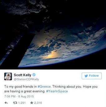 Ο Κέλι αφού τράβηξε μία φωτογραφία της χώρας μας για να δείξει πως φαίνεται από τον Διεθνή Διαστημικό Σταθμό, τη πόσταρε στο Twitter του και έγραψε: «Για τους καλούς μου φίλους στην Ελλάδα. Σας σκέφτομαι. Εύχομαι να έχετε ένα υπέροχο βράδυ».