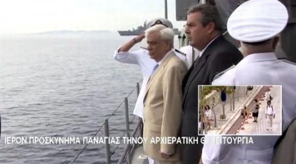 Ο Πρόεδρος της Δημοκρατίας, συνοδευόμενος από τον υπουργό Άμυνας, επιβιβάστηκε στην τορπιλάκατο Σταράκης, από όπου κατευθύνθηκε στα ανοιχτά του λιμανιού της Τήνου και στο σημείο του τορπιλισμού του αντιτορπιλικού Έλλη, πριν από 75 χρόνια τον Δεκαπενταύγουστο του 1940, έριξε στεφάνι, ενώ τηρήθηκε ενός λεπτού σιγής στη μνήμη των πεσόντων ναυτών και αξιωματικών του αντιτορπιλικού