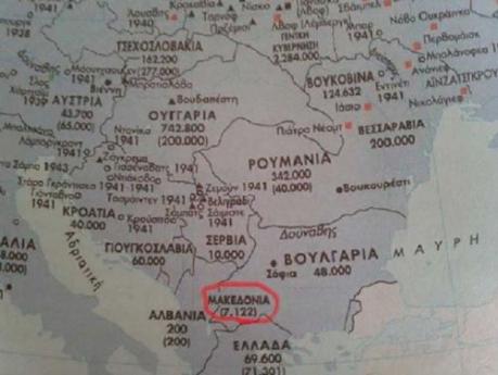 Στη σελίδα 130 του βιβλίου υπάρχει ένα χάρτης των κυριότερων ναζιστικών στρατοπέδων συγκέντρωσης στη Γερμανία και την κατεχόμενη Ευρώπη στα οποία θανατώθηκαν εκατομμύρια άνθρωποι, όπως αναφέρεται χαρακτηριστικά. Σε αυτόν τον χάρτη τα Σκόπια αναφέρονται ως «Μακεδονία».