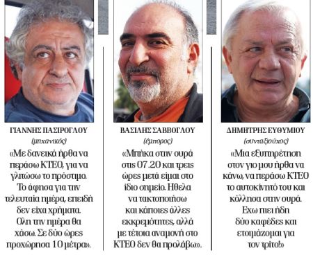 Λίγο μετά τις 11.00, η ουρά στο ΚΤΕΟ της Car Control στην Πέτρου Ράλλη ξεπερνά τα 50 μέτρα. Οπως εξηγούν οι υπάλληλοι, η καθυστέρηση οφείλεται κυρίως στη διαδικασία έκδοσης του ηλεκτρονικού παραβόλου. «Τυπώνεται μέσω του TAXISNET, αλλά η εφαρμογή είναι καινούργια και οι περισσότεροι δεν τη γνωρίζουν. Το τυπώνουμε λοιπόν εμείς» εξηγούν. Πίσω στην ουρά, ένα νεαρό ζευγάρι αποφασίζει να το διασκεδάσει βάζοντας δυνατή μουσική, ηλικιωμένοι κλειδώνουν τα αυτοκίνητά τους και «εξερευνούν» τους γύρω δρόμους, ενώ αρκετοί μοιράζονται τον… πόνο τους με φίλους και συγγενείς. «Τώρα είμαι περίπου στη μέση της ουράς. Βλέπω ένα φορτηγό κοντά στην είσοδο, ακίνητο εδώ και δύο ώρες. Τι μαγείρεψες τελικά; Οχι, μη με περιμένετε, αποκλείεται να ξεμπερδέψω πριν από το απόγευμα».