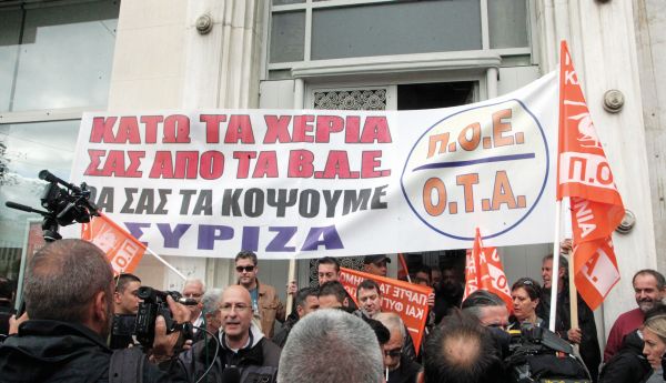 Κρατώντας πανό με το σύνθημα «Κάτω τα χέρια από τα βαρέα και ανθυγιεινά – Θα σας τα κόψουμε ΣΥΡΙΖΑ», περίπου 20 συνδικαλιστές της Πανελλήνιας Ομοσπονδίας Εργαζομένων στους Οργανισμούς Τοπικής Αυτοδιοίκησης (ΠΟΕ – ΟΤΑ) εισέβαλαν χθες το πρωί στο γραφείο του αναπληρωτή υπουργού Οικονομικών Γιώργου Χουλιαράκη στο Γενικό Λογιστήριο του Κράτους και έκαναν… προληπτική κατάληψη!