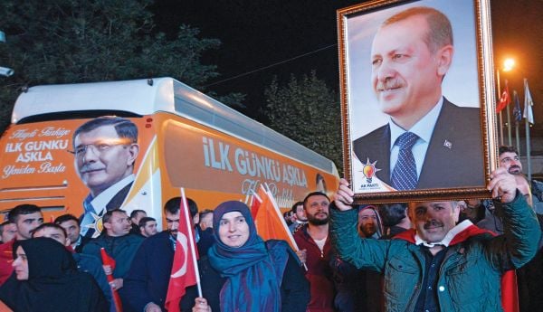 Το κόμμα Δικαιοσύνης και Ανάπτυξης (AKP) σημείωσε νίκη με ποσοστό 49,5%, όπως δείχνουν τα αποτελέσματα με καταμετρημένες τις ψήφους σε πάνω από το 97% των εκλογικών τμημάτων στην Τουρκία. Κι ενώ το Κόμμα Δικαιοσύνης και Ανάπτυξης των Νταβούτογλου – Ερντογάν εκλέγει 315 βουλευτές, η δύναμη των κομμάτων της αντιπολίτευσης μειώθηκε αισθητά, με το Ρεπουμπλικανικό Λαϊκό Κόμμα (CHP) να «σκοράρει» 25,49% και 135 βουλευτές, το κουρδικό Κόμμα Δημοκρατίας των Λαών (HDP) 10,52% και 59 βουλευτές και το κόμμα Εθνικιστικής Δράσης (MHP) 12,01% και 41 βουλευτές.