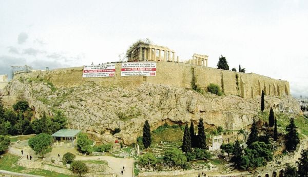 Δύο μεγάλα πανό σήκωσαν» νωρίς το πρωί του Σαββάτου στην Ακρόπολη μέλη του ΚΚΕ και της ΚΝΕ, σε ένδειξη αλληλεγγύης για τους πρόσφυγες.