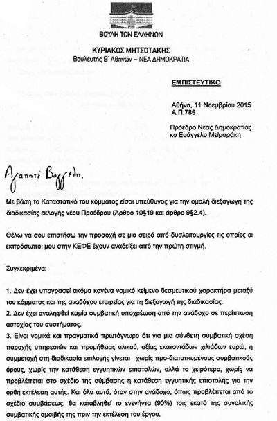 «Αγαπητέ Βαγγέλη, με βάση το καταστατικό του κόμματος είσαι υπεύθυνος για την ομαλή διεξαγωγή της διαδικασίας εκλογής νέου προέδρου (άρθρο 10 παραγ. 19 και άρθρο 9 παραγ. 2.4)» έγραφε ο Κυριάκος Μητσοτάκης και πρόσθετε: «Θέλω να σου επιστήσω την προσοχή σε μια σειρά από δυσλειτουργίες, τις οποίες οι εκπρόσωποί μου στην ΚΕΦΕ έχουν αναδείξει από την πρώτη στιγμή».