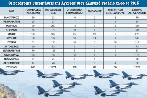 Στον συνολικό πίνακα που έδωσε το Γενικό Επιτελείο καταγράφονται 863 παραβιάσεις των Κανόνων Εναερίου Κυκλοφορίας (ΚΕΚ) εντός του FIR Αθηνών και 1.777 παραβάσεις (!) του εθνικού εναέριου χώρου, υποχρεώνοντας τους Ελληνες πιλότους να αναχαιτίζουν καθημερινά τους εισβολείς. Στις αερομαχίες που έλαβαν χώρα σημειώθηκαν 80 εμπλοκές.