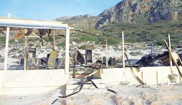 Ενας σωρός από στάχτες, μια σειρά από όρθια καμένα δοκάρια αλλά και δεκάδες απανθρακωμένα μηχανήματα είναι τα μόνα που απέμειναν να θυμίζουν την ύπαρξη της δημοφιλούς καντίνας στην ειδυλλιακή παραλία του Μπάλου, στον Δήμο Κισσάμου της Κρήτης.
