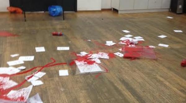 Σύμφωνα με πληροφορίες 15 άτομα εισέβαλαν στο χώρο, πέταξαν μπογιές και έσπασαν κάλπες, ενώ κατέβασαν και ένα πανό. Μάλιστα με μπογιές έγραψαν «ο Τεμπονέρας ζει».