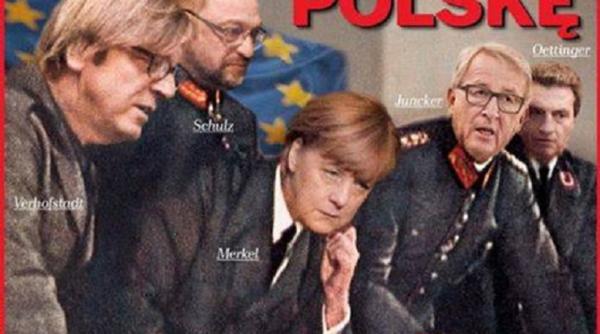 Κι όμως, στο εξώφυλλο του νέου τεύχους του δημοφιλούς περιοδικού εμφανίζονται οι αξιωματούχοι της ΕΕ σε ρόλο… ναζί να είναι σκυμμένοι πάνω από ένα χάρτη -μια εικόνα που θυμίζει τον Χίτλερ με τους στρατηγούς του- ενώ το σχετικό δημοσίευμα κυκλοφορεί υπό τον τίτλο: «Αυτοί οι άνθρωποι θέλουν να ελέγξουν ξανά την Πολωνία».
