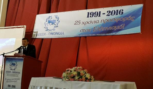 Για την 25χρονη δράση της Ομόνοιας προβλήθηκε οπτικοακουστικό υλικό και εισηγήθηκε το ιστορικό στέλεχος Βαγγέλης Παπαχρήστος με θέμα «25 χρόνια Ομόνοιας, προσφορά στον Ελληνισμό». Στην συνέχεια διαβάστηκε το μήνυμα του Προέδρου της Ελληνικής Δημοκρατίας κ.Προκόπη Παυλόπουλου ο οποίος τόνισε μεταξύ άλλων ότι: Η Ελλάδα θα συνεχίσει να βρίσκεται πάντα στο πλευρό της Ομόνοιας, έτοιμη να συνδράμει και να ενισχύσει την κάθε προσπάθειά της. Ακολούθησε η ομιλία του κ. Ylli Asllani ο οποίος εκπροσώπησε τον πρόεδρο της Αλβανικής Δημοκρατίας BujarNishani και διάβασε το μήνυμά του για τα 25χρονα της Ομόνοιας. Από τους παρόντες προσκεκλημένους, την εκδήλωση χαιρέτισαν ο Πρέσβης της Ελλάδος στα Τίρανα κ. Λεωνίδας Ροκανάς, ο Πρόεδρος του ΚΕΑΔ κ. Βαγγελης Ντουλες, ο κ. Γιώργος Τρίχας εκπροσωπώντας του Υφυπουργό Εξωτερικών της Ελλάδος αρμόδιο για θέματα ομογένειας κ. Γιάννη Αμανατίδη και ο βουλευτής Ιωαννίνων κ. Γιάννης Καραγιάννης εκπροσωπώντας τον Σύριζα.