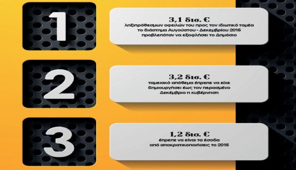 1. Το Δημόσιο προβλεπόταν να αποπληρώσει 3,1 δισ. ευρώ ληξιπροθέσμων οφειλών του προς τον ιδιωτικό τομέα το διάστημα Αυγούστου – Δεκεμβρίου του 2015, επί συνόλου 7 δισ. ευρώ ληξιπρόθεσμων χρεών που, σύμφωνα με το Μνημόνιο, πρέπει να αποπληρωθούν ως τον Αύγουστο του 2018. Ωστόσο, μόλις περί το 1 δισ. ευρώ διατέθηκε τελικά την περσινή χρονιά για τον συγκεκριμένο σκοπό.