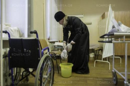 Ο Μητροπολίτης χωρίς να χάσει χρόνο άφησε την ράβδο και έβγαλε το εγκόλπιο, και άρχισε να σφουγγαρίζει τα δωμάτια των ασθενών.
