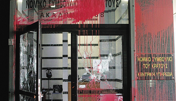 Καταδρομική επίθεση στο κτίριο όπου στεγάζεται το Νομικό Συμβούλιο του Κράτους, στη συμβολή των οδών Ακαδημίας και Χαριλάου Τρικούπη, πραγματοποίησε χθες το μεσημέρι ομάδα αντιεξουσιαστών. Οι δράστες, σύμφωνα με αυτόπτες μάρτυρες, ήταν περίπου 10 και λίγα λεπτά μετά τις 2 το μεσημέρι επιτέθηκαν με βαριοπούλες στο κτίριο, σπάζοντας τα τζάμια της πρόσοψης. Αλλα άτομα από την ίδια ομάδα πέταξαν κόκκινη μπογιά στην είσοδο και στις επιγραφές, ενώ έριξαν και φέιγ βολάν (τρικάκια) με συνθήματα κατά του αντιτρομοκρατικού νόμου («Αμεση κατάργηση των τρομονόμων») και υπέρ της απελευθέρωσης των πολιτικών κρατουμένων.