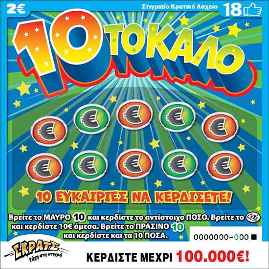 Η γκάμα παιχνιδιών του ΣΚΡΑΤΣ διευρύνεται και αυτή περιλαμβάνει πλέον το νέο παιχνίδι «10 το Καλό». Ο παίκτης με 2 ευρώ μπορεί να κερδίσει μέχρι και 100.000 ευρώ.