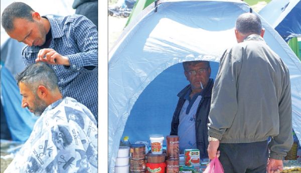 Εκεί, μια ανάσα μακριά από τον επόμενο σταθμό του ταξιδιού τους, τα Σκόπια, οι ξεριζωμένοι των πολέμων της Μέσης Ανατολής φτιάχνουν άζυμο ψωμί, κουρεύουν τους συμπατριώτες τους σε πρόχειρα κουρεία και πωλούν φρούτα, λαχανικά ή άλλα καθημερινά αγαθά προκειμένου να αγοράσουν φάρμακα.