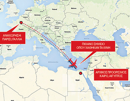 Τ ο Airbus Α320 της EgyptAir που εκτελούσε την πτήση MSR 804 Παρίσι – Κάιρο με 66 επιβαίνοντες, περνώντας και μέσα από τον ελληνικό εναέριο χώρο, εξαφανίστηκε από τα ελληνικά ραντάρ νότια της Καρπάθου, υπό καλές καιρικές συνθήκες και ενώ βρισκόταν πια στο αιγυπτιακό FIR. Η ώρα ήταν 3.29 χθες τα ξημερώματα. Πολλές ώρες αργότερα 230 μίλια νοτιοανατολικά της Κρήτης εντοπίστηκαν συντρίμμια, και αρχικά όλοι θεώρησαν πως ανήκαν στο μοιραίο αεροσκάφος. Ωστόσο χθες το βράδυ ο πρόεδρος της Επιτροπής Αεροπορικών Ατυχημάτων Αθανάσιος Μπίνης δήλωσε πως τα συντρίμμια που έχουν βρεθεί δεν ανήκουν στο μοιραίο αεροσκάφος. Στο μεταξύ, τα πρώτα στοιχεία για τη μοιραία πτήση οδηγούν στη σκέψη πως δεν πρόκειται για δυστύχημα. Αυτό φαίνεται να προκύπτει από τη «σιωπή» ανάμεσα στις 2.48 π.μ., οπότε εξήλθε από τον ελληνικό εναέριο χώρο, και τις 3.27 π.μ., οπότε το Κέντρο Ελέγχου Αθηνών προσπάθησε να επικοινωνήσει με το αεροσκάφος, χωρίς ανταπόκριση. Οπως αναφέρει η ΥΠΑ, στην τελευταία επικοινωνία του Ελληνα ελεγκτή με το αεροσκάφος στις 2.48, που υπήρξε και το τελευταίο «σημείο ζωής» του, ο πιλότος «ήταν ευδιάθετος και τον ευχαρίστησε στα ελληνικά». Λίγα λεπτά αργότερα, στις 3.29, χάθηκε το σήμα του αεροσκάφους από τα ραντάρ, εντός του αιγυπτιακού εναέριου χώρου.