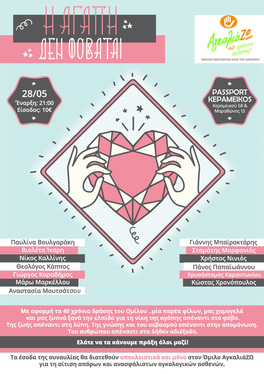 Το αποτέλεσμα; ..μία παρέα φίλων, χαμογελά και ξυπνά ξανά την ελπίδα για την νίκη της ζωής απέναντι στον φόβο. Της αγάπης απέναντι στην λύπη. Της γνώσης και του σεβασμού απέναντι στην απομόνωση. Του ανθρώπου απέναντι στα δήθεν αδιέξοδα. Ελάτε να τα κάνουμε πράξη όλοι μαζί! Με ιδιαίτερη, λοιπόν, τιμή και χαρά, σας προσκαλώ στην Συναυλία Προσφοράς και Αγάπης: “Η ΑΓΑΠΗ ΔΕΝ ΦΟΒΑΤΑΙ!”